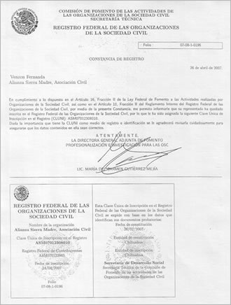 ALIANZA SIERRA MADRE es una asociación civil sin fines de lucro, que se constituyó el 23 de enero del 2007, de acuerdo al permiso 0801.352 de la Secretaria de Relaciones Exteriores, registro Público de la Propiedad Núm. 33 FOLIO No.56 del Libro Numero 112 de la Sección Cuarta, del 22 de Marzo del 2007, el registro oficial de la organización RFC ASMO 112 DE LA SECCIÓN CUARTA, DEL 070123865, con sede en la ciudad de Chihuahua, Estado de Chihuahua, México.